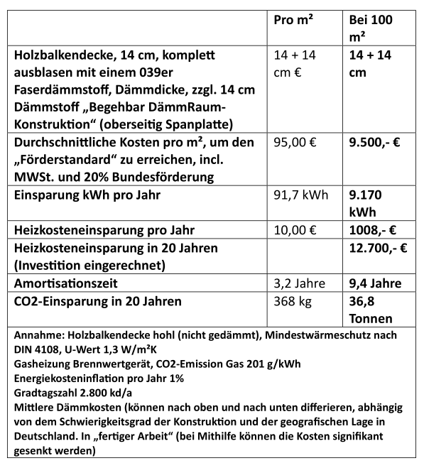 Nach den Außenwänden sind Dächer bzw. obere Geschoßdecken die größten Flächen, über die kostbare Heizenergie verloren geht. Wird der Spitzboden unter dem Dach nicht bewohnt und damit auch nicht beheizt, ist eine Dämmung des Daches sinnfrei, da viel zu teuer und die einsparbare Heizenergie ist geringer, als wenn, wie im folgenden vorgestellt, die Decke gedämmt wird. Holzbalkendecken – auch Kehlbalkenlagen genannt – sind häufig hohlschichtig oder nur mit schmalen Dämmstoffschichten versehen. Eine oberseitige Dämmung dieser Hohlschichtdecken ist aufgrund von Hinterlüftungseffekten (die Luft streicht waagerecht von Dachfläche zu Dachfläche unter dem Dielenboden) thermisch fast wirkungslos.